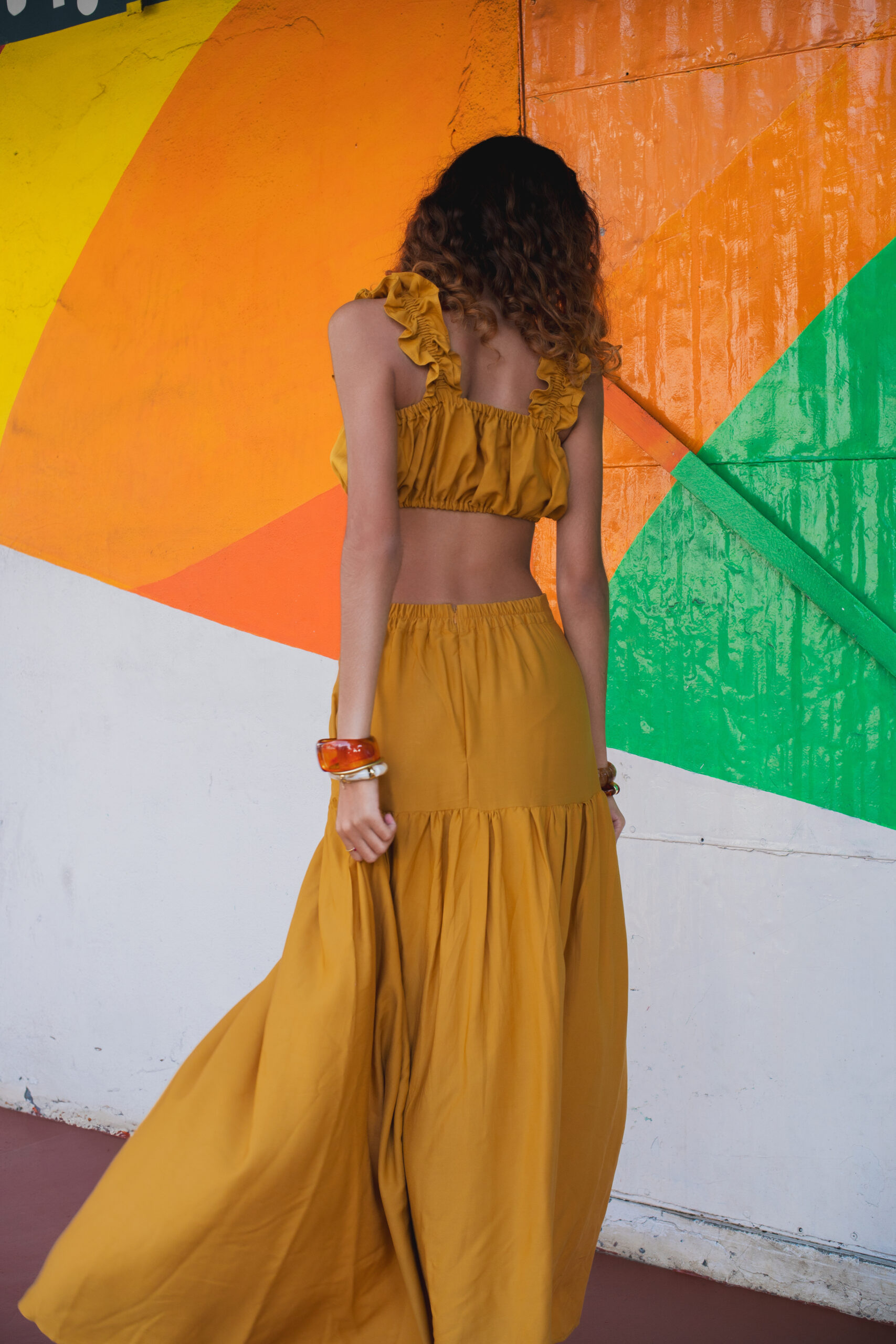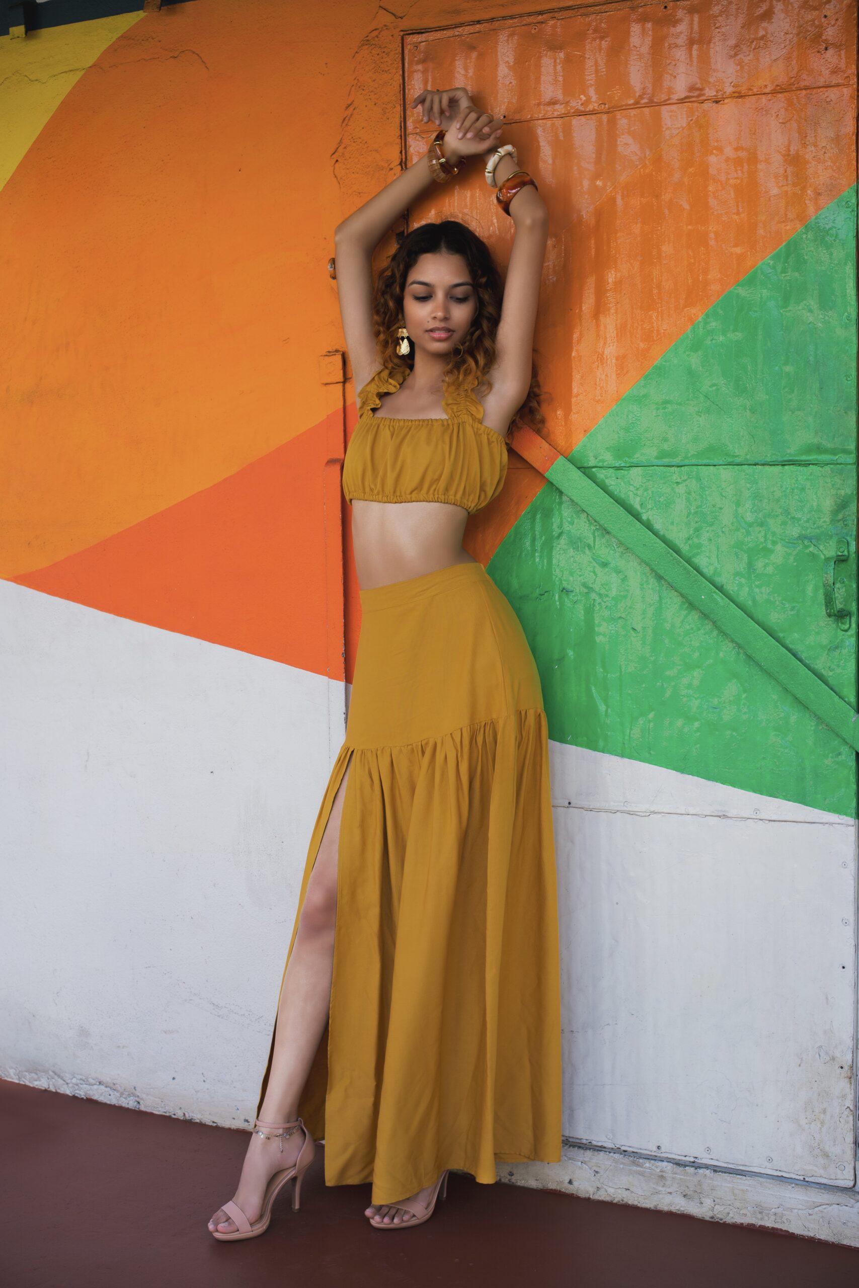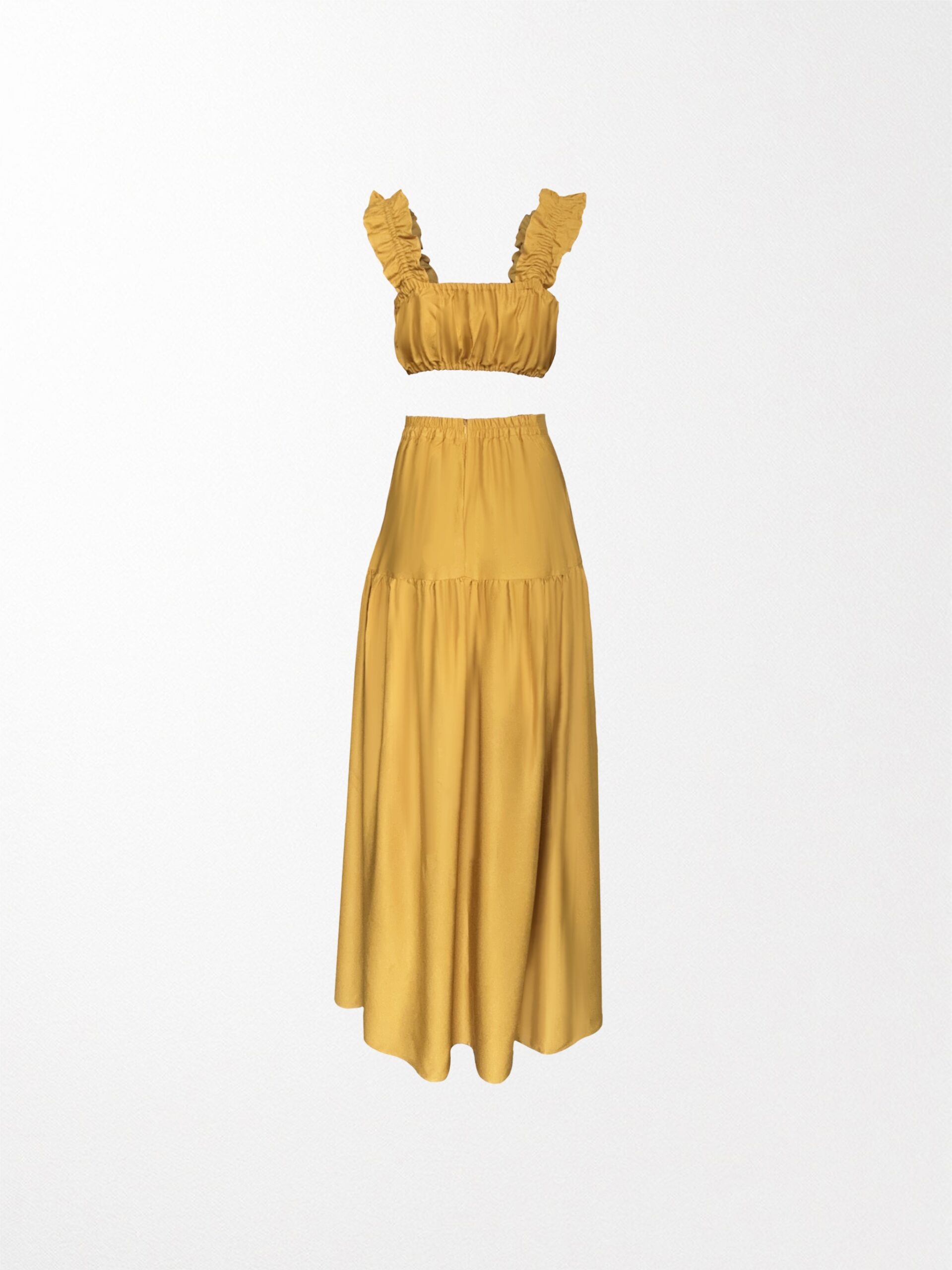 MUSTARD FLOWY SET WITH ELASTICATED RUFFLE STRAPS TOP PAIRED WITH A HIGH WAISTED SIDE SLIT SKIRT ADJUSTABLE AT THE BACK OF THE WAISTLINE.